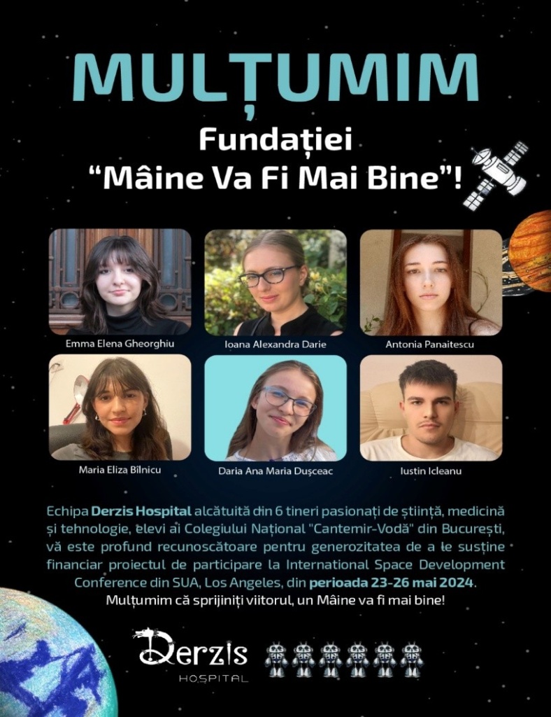 Echipa Derzis Hospital formată din: Emma Elena Gheorghiu, Ioana Alexandra Darie, Antonia Panaitescu, Maria Eliza Bîlnicu, Daria Ana-Maria Dusceac și Iustin Icleanu a reușit să impresioneze juriul National Space Society (NSS) într-un concurs la care au participat 5.200 de echipe din 28 de țări, obținând o mențiune onorifică remarcabilă.